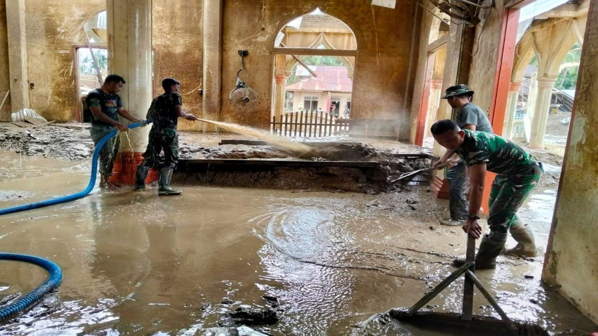Personel TNI menyebar di titik-titik terdampak untuk membersihkan rumah, sekolah, tempat ibadah, hingga akses penghubung antarwilayah.