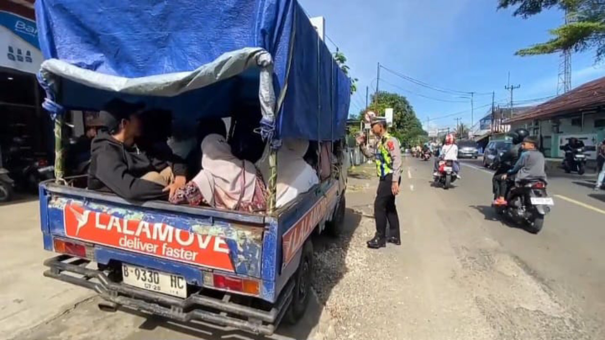 Petugas terlihat menghentikan kendaraan pickup untuk memberikan edukasi kepada pengemudi terkait risiko membawa penumpang di bagian belakang kendaraan.